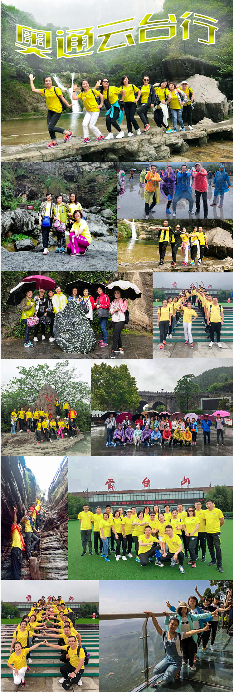 河南被稱為中華民族與華夏文明的發(fā)源地,河南地處中原,洛陽、開封又是中國歷史上諸多王朝的都城所在地。這里歷史古跡眾多,文化淵源深厚。在這個秋天奧通公司特組織員工到這文化深厚自然景色宜人的地方游覽,豐富員工文化生活、緩解員工工作壓力及加強公司團隊凝聚力,主要游覽了云臺山、龍門石窟、少林寺,雖走馬觀花,卻令人驚詫、感嘆不已。第一站我們游覽的是嵩山少林寺,少林文化是中國傳統(tǒng)文化的重要組成部分,到這里,當然要游覽少林寺、看塔林、欣賞武術(shù)表演,但更令人印象深刻的是少林文化的強大氣場,這里教學、住宿樓房林立、配套商業(yè)、服務設施齊全,少林文化就是從這里傳播到了全世界。這一天小雨輕飛,吃過午飯我們又驅(qū)車前往龍門石窟。在雨中的龍門石窟,是那樣古樸典雅,在堅硬的石壁上鑿出石窟、雕刻出如此精美的各類佛教人物塑像、其精湛的技藝、虔誠的信仰、實在令人嘆為觀止。第二天依舊煙雨蒙蒙,我們懷著激動的心情來到了云臺山,,步入紅石峽、小寨溝景區(qū),震人心魄的景色映入眼簾。碧水青山紅石蜿蜒,雨后泥土的馨香,加上好似云霧從天而降的瀑布,人間仙境一般。短暫的行程,雖有些許疲憊,但卻收獲了無限美景和快樂,而這段時間,最開心的是大家不慌不忙說說笑笑一起拍照,感覺好輕松好隨性,奧通這個大家庭,愛的味道在我們之間彌漫,我們將文化里人文風情中的親情愈演愈烈,感謝時光,感謝奧通這個平臺,把我和你變成了我們。不管是在工作中還是在游山玩水中我們互幫互助,一起前進。這一路上我們有收獲,有幸福,相信這會是時間都偷不走的最美好的片段!